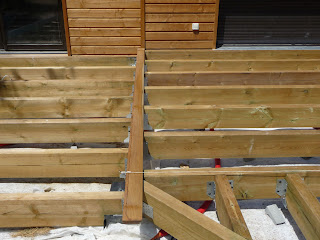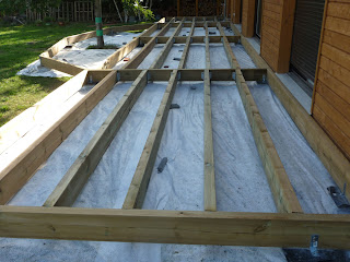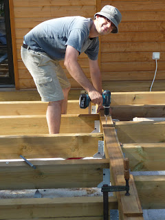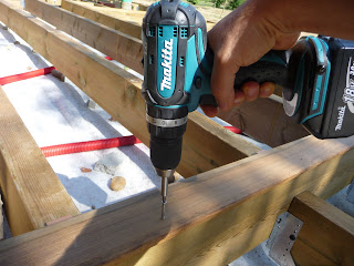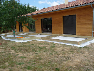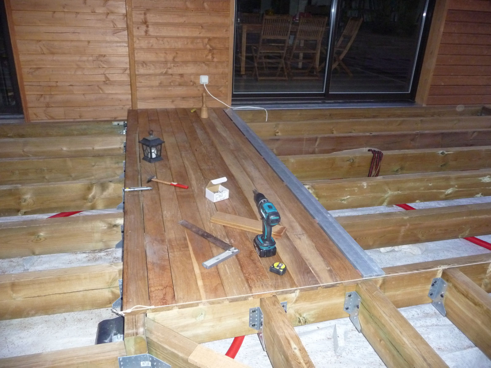 Ca y est on va bientôt pouvoir marcher sur notre terrasse. La pose de la première lame est toujours délicate car c'est elle qui
