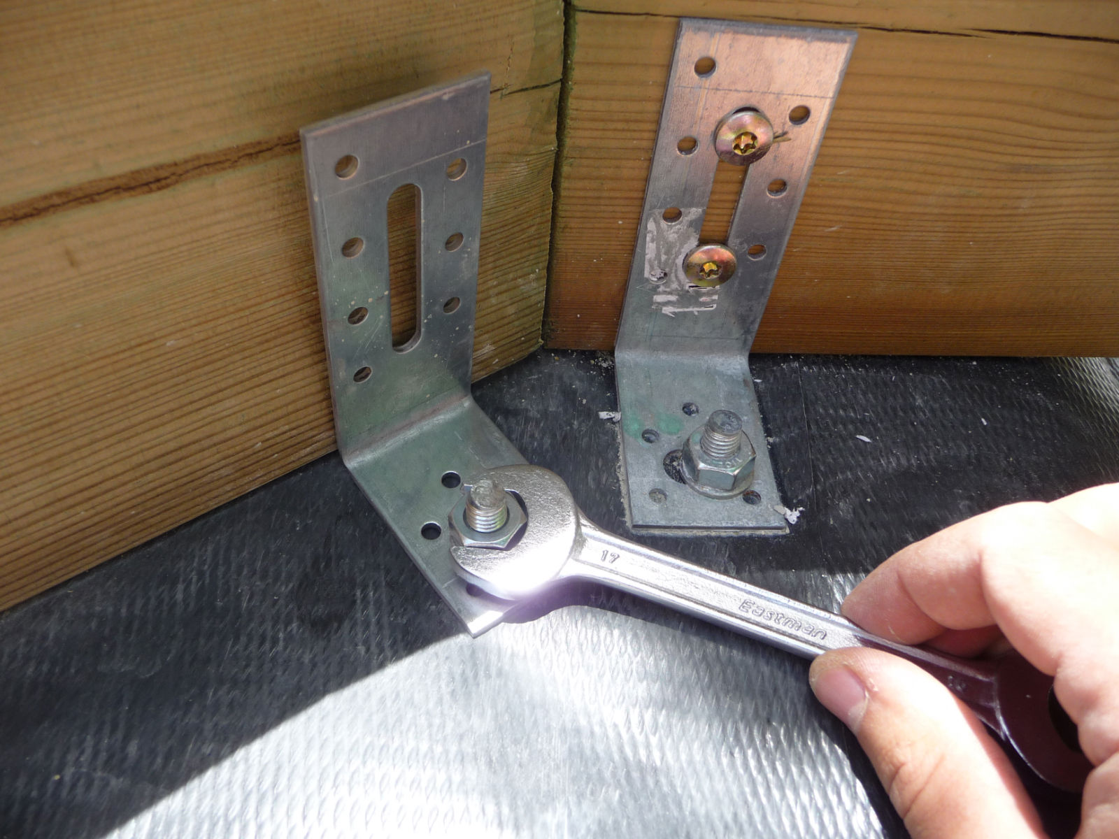 les autres par des vis cachées par des clips en pvc qui s'emboitent dans les lames de bois. Dans mon cas de figure, je vais devoir l'ajuster à nouveau...