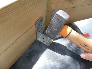 Puis il va falloir fixer solidement les poutres (solives) sur chaque plots afin d'avoir une ossature