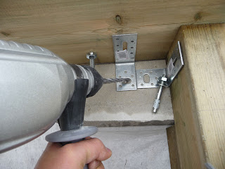 porteuse solide. Chaque poutre a été fixée sur les plots béton par des équerres de renfort en acier (10cmx5cm) et par l'intermédiaire de goujons spit, des deux côtés des poutres (solives). Dans l'ordre, il faut d'abord
